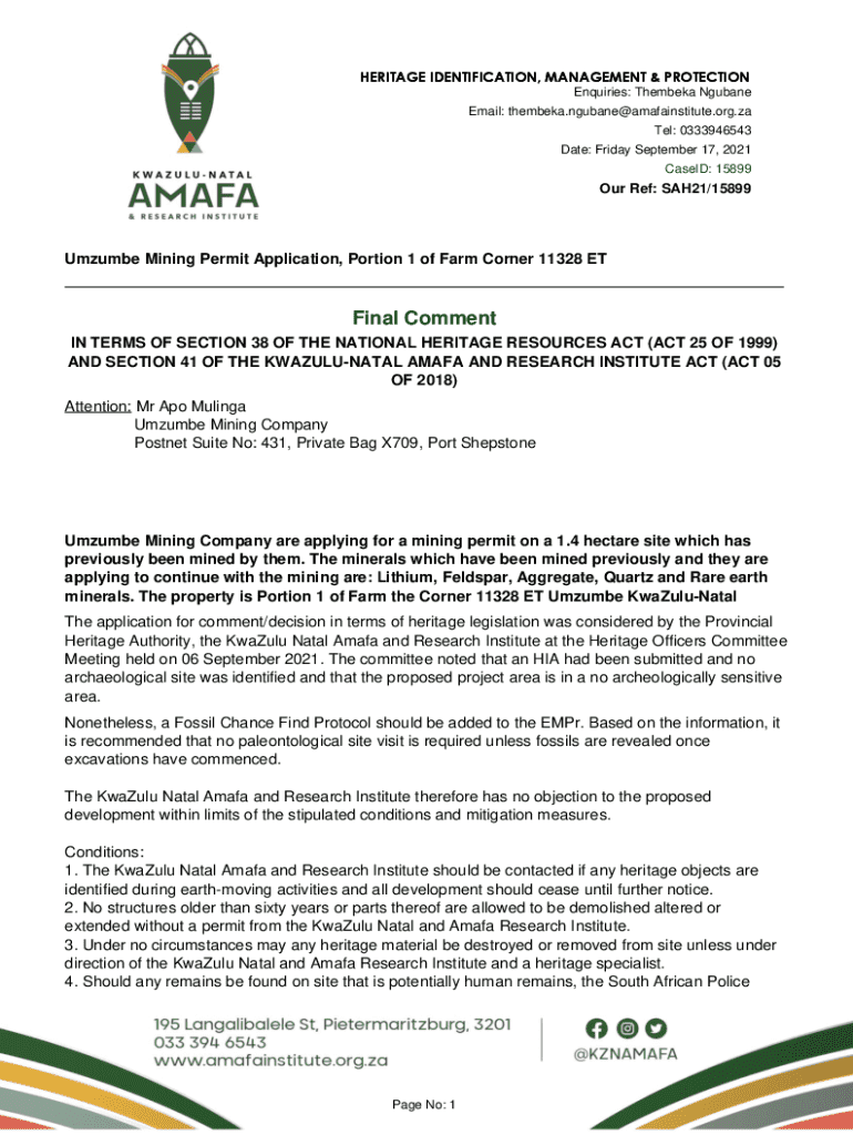 HERITAGE IDENTIFICATION, MANAGEMENT & PROTECTION Enquiries: Thembeka Ngubane Email: thembeka.ngubane@amafainstitute.org.za Tel: 0333946543 Date: Friday September 17, 2021 CaseID: 15899Our Ref: SAH21/15899Umzumbe