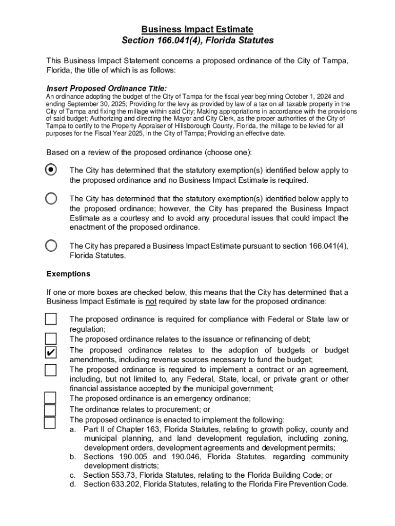 This document provides a Business Impact Estimate concerning a proposed ordinance related to the budget of the City of Tampa for the fiscal year 2024-2025. It outlines the necessity for a tax levy on taxable property, appropriations in line with the budget provisions, and certifies the millage to be levied for various purposes, while assessing potential impacts on private businesses within the city.