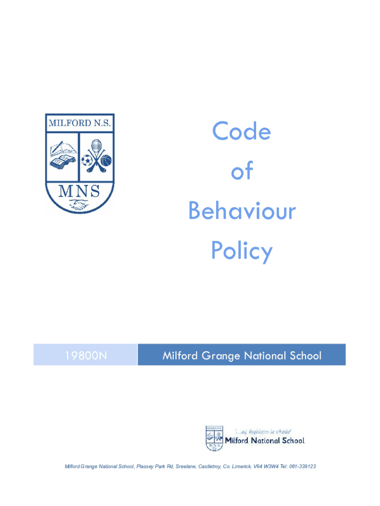 This document outlines the Code of Behaviour for Milford Grange National School, detailing the standards of behaviour expected from pupils, the measures taken for non-compliance, and the policies in place to promote positive behaviour and self-discipline among students. It includes information on the school\'s strike and card system for managing behaviour, restorative practices to resolve conflicts, and guidelines for pupil conduct in various settings.