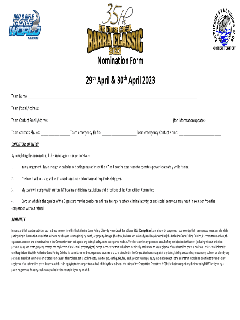 Nomination Form 29th April & 30th April 2023 Team Name: ___ Team Postal Address: ___ Team Contact Email Address: ___ (for information updates) Team contacts Ph. No: ___Team emergency Ph No: ___Team