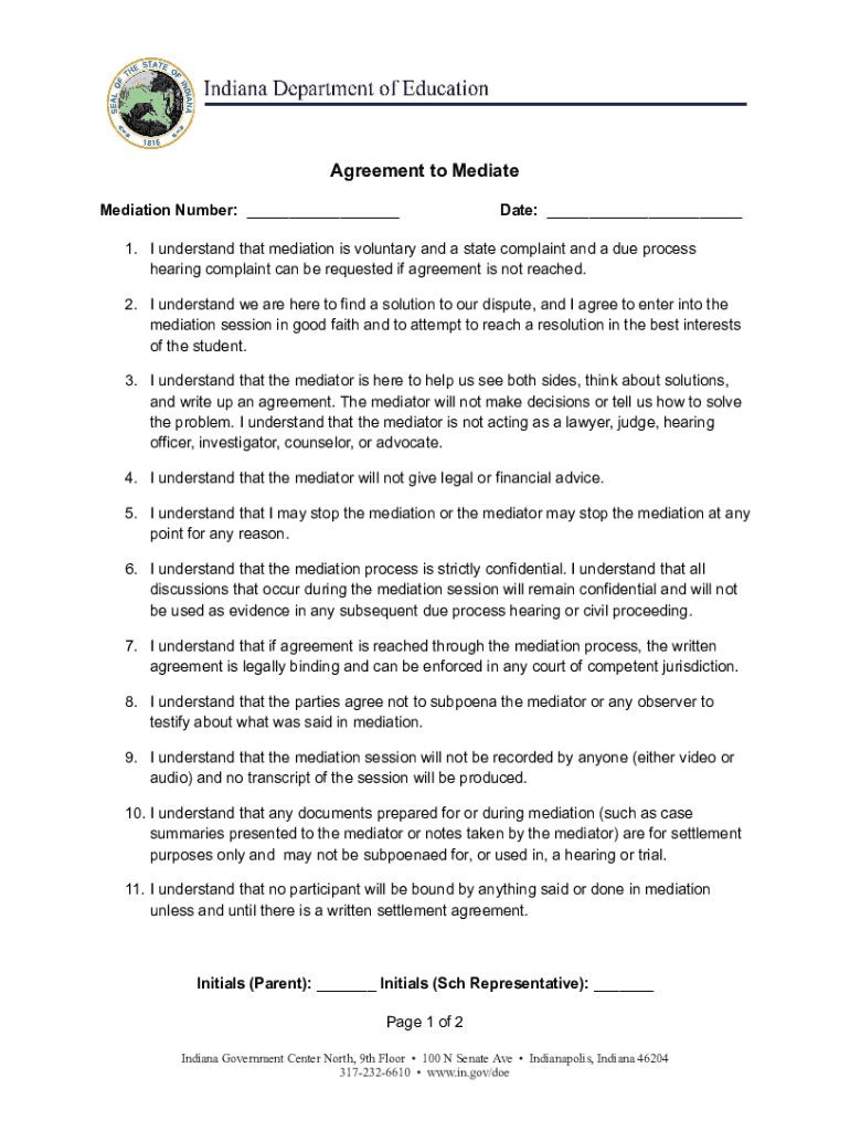 Agreement to Mediate Mediation Number: ___Date: ___1. I understand that mediation is voluntary and a state complaint and a due process hearing complaint can be requested if agreement is not reached.