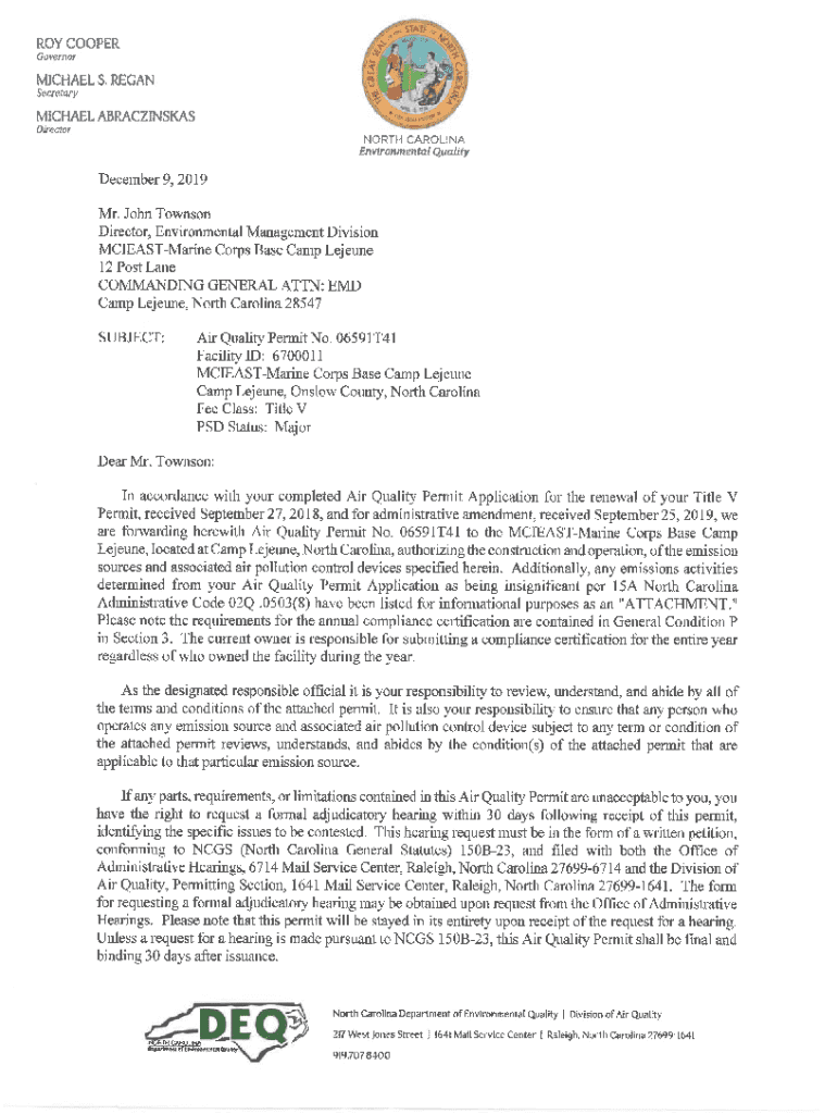 This document is an Air Quality Permit issued by the North Carolina Department of Environmental Quality for MCIEAST-Marine Corps Base Camp Lejeune. The permit authorizes the construction and operation of specified emission sources and associated air pollution control devices at the facility. It outlines specific limitations, requirements, and conditions to ensure compliance with air quality standards and regulations.