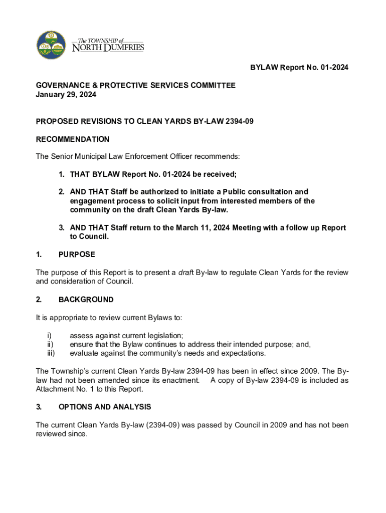 This report presents the proposed revisions to the Clean Yards By-law in order to align with current legislation and address community needs. It recommends initiating a public consultation process and includes an overview of the changes proposed to the existing by-law.