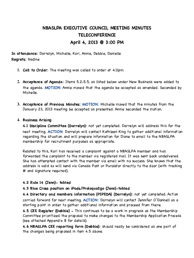 NBASLPA EXECUTIVE COUNCIL MEETING MINUTES TELECONFERENCE April 4, 2013 @ 3:00 PM In attendance: Darrelyn, Michelle, Kari, Annie, Debbie, Danielle Regrets: Nadine 1. Call to Order: The meeting was