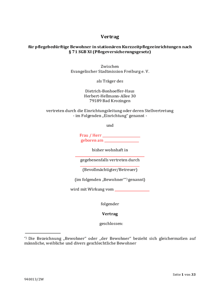 Vertrag fr pflegebedrftige Bewohner in stationren Kurzzeitpflegeeinrichtungen nach 71 SGB XI (Pflegeversicherungsgesetz) Zwischen Evangelischer Stadtmission Freiburg e. V. als Trger des DietrichBonhoefferHaus