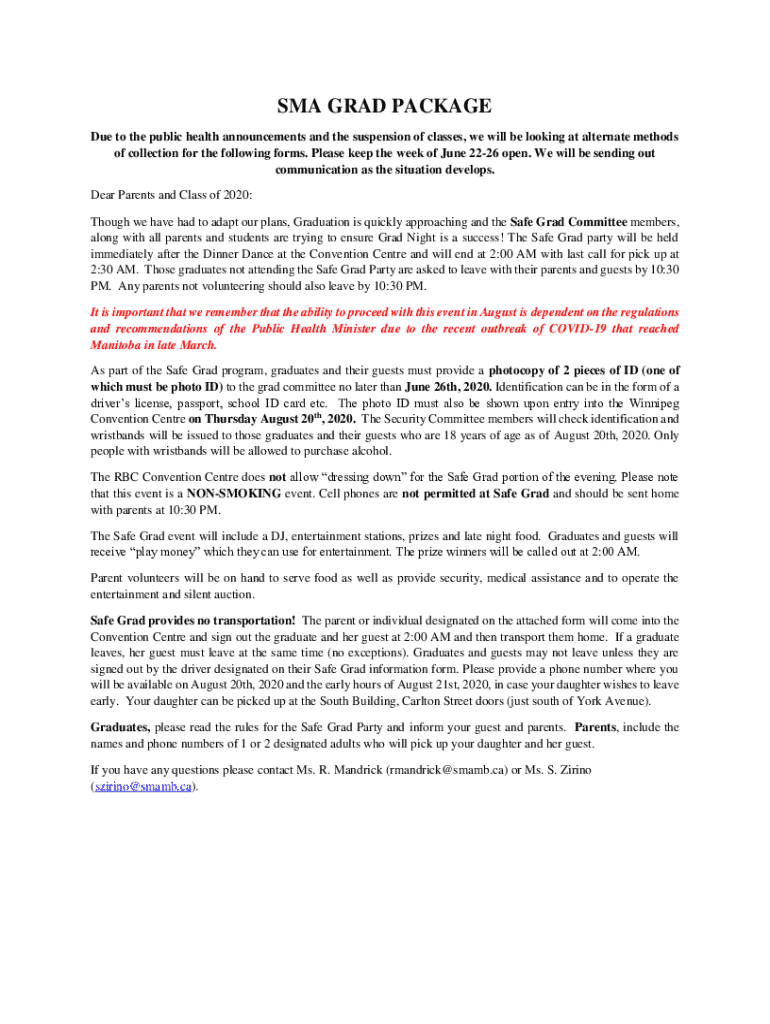 SMA GRAD PACKAGE Due to the public health announcements and the suspension of classes, we will be looking at alternate methods of collection for the following forms. Please keep the week of June 2226