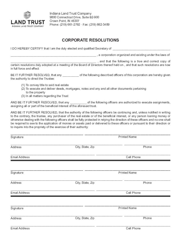 Indiana Land Trust Company9800 Connecticut Drive, Suite B2900 Crown Point, IN 46307 Phone: (219) 6612792 Fax: (219) 6623489CORPORATE RESOLUTIONS I DO HEREBY CERTIFY that I am the duly elected and
