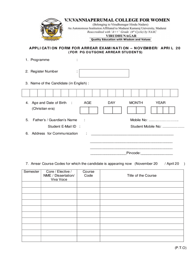 Get the free Application Form for Arrear Examination