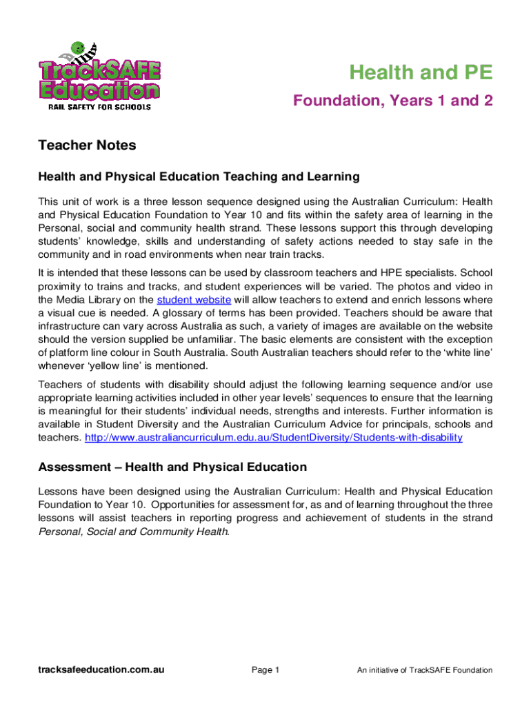 Health and PE Foundation, Years 1 and 2 Teacher Notes Health and Physical Education Teaching and Learning This unit of work is a three lesson sequence designed using the Australian Curriculum: Health