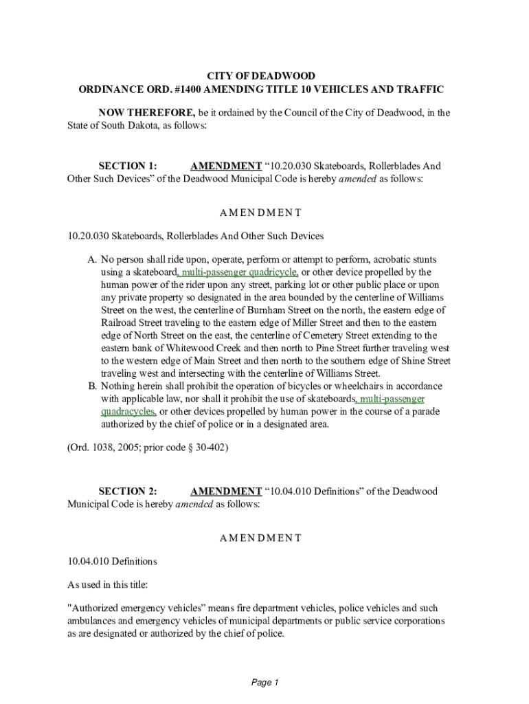 CITY OF DEADWOOD ORDINANCE ORD. #1400 AMENDING TITLE 10 VEHICLES AND TRAFFIC NOW THEREFORE, be it ordained by the Council of the City of Deadwood, in the State of South Dakota, as follows:SECTION
