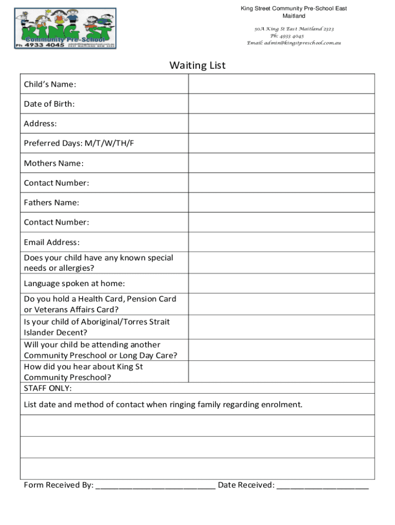King Street Community PreSchool East Maitland 50A King St East Maitland 2323 Ph: 4933 4045 Email: admin@kingstpreschool.com.auWaiting List Childs Name: Date of Birth: Address: Preferred Days: M/T/W/TH/F