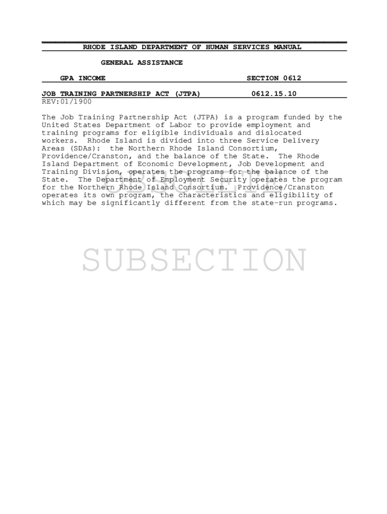 ___ RHODE ISLAND DEPARTMENT OF HUMAN SERVICES MANUAL GENERAL ASSISTANCE GPA INCOME JOB TRAINING PARTNERSHIP ACT (JTPA) REV:01/1900SECTION 0612 0612.15.10The Job Training Partnership Act (JTPA) is