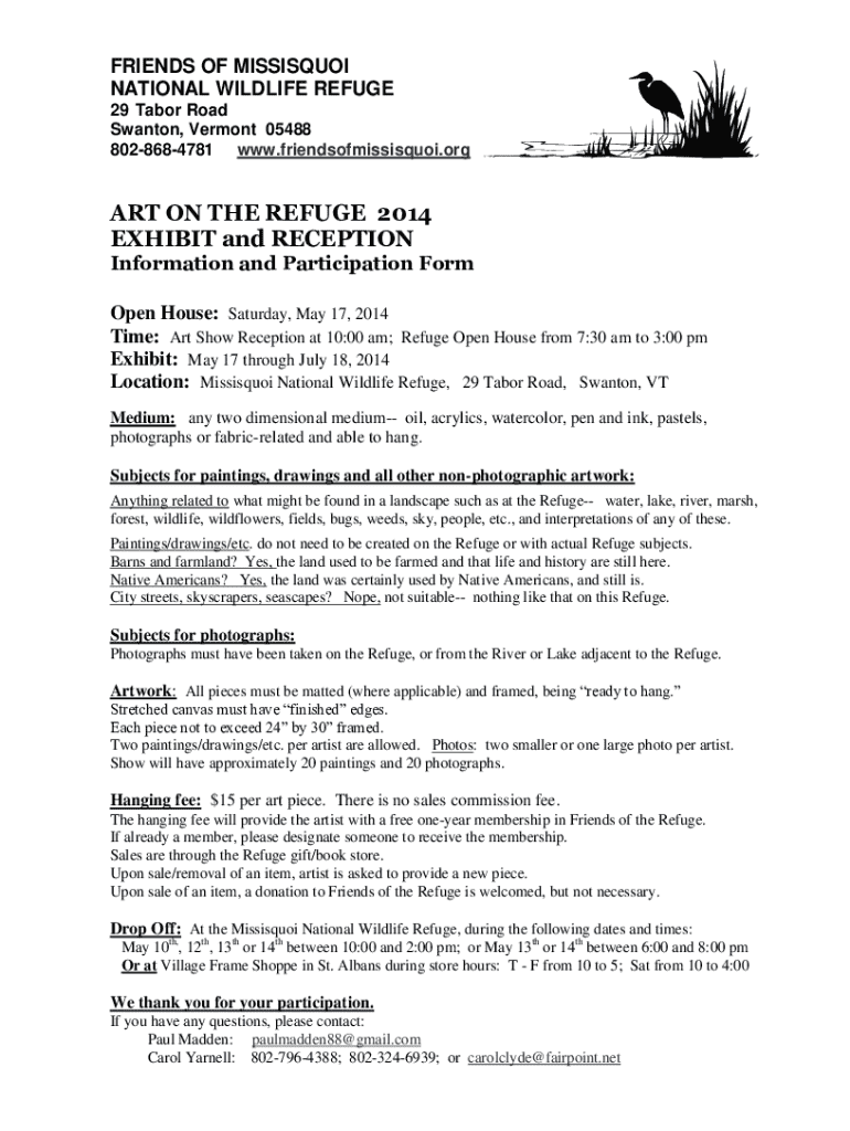 Participation form for the Art on the Refuge exhibit taking place at the Missisquoi National Wildlife Refuge from May 17 through July 18, 2014. This form collects necessary information from artists wishing to exhibit their artwork, outlines the guidelines for submitted pieces, and includes details regarding the hanging fee, participation conditions, and contact information for organizers.