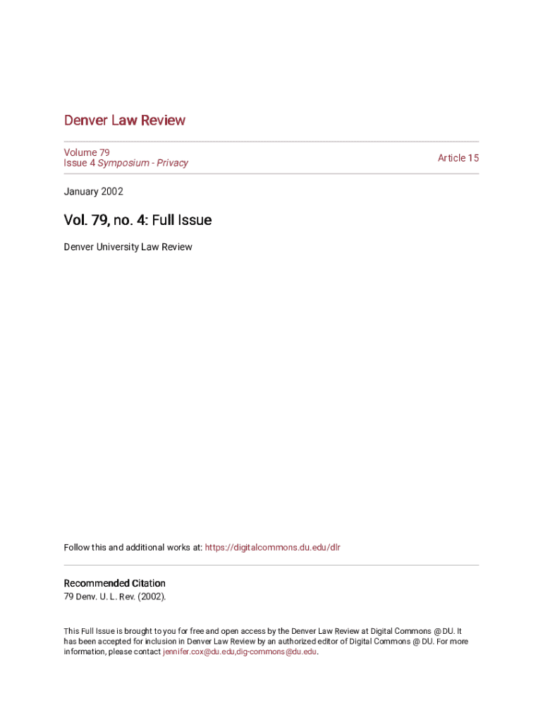 This issue of the Denver Law Review focuses on the complexities of privacy in various contexts including workplace surveillance, medical records, sodomy laws, and consumer privacy through supermarket cards. It discusses the legal implications of privacy rights, the balance between societal interests and individual privacy expectations, and the evolving nature of privacy in the digital age.