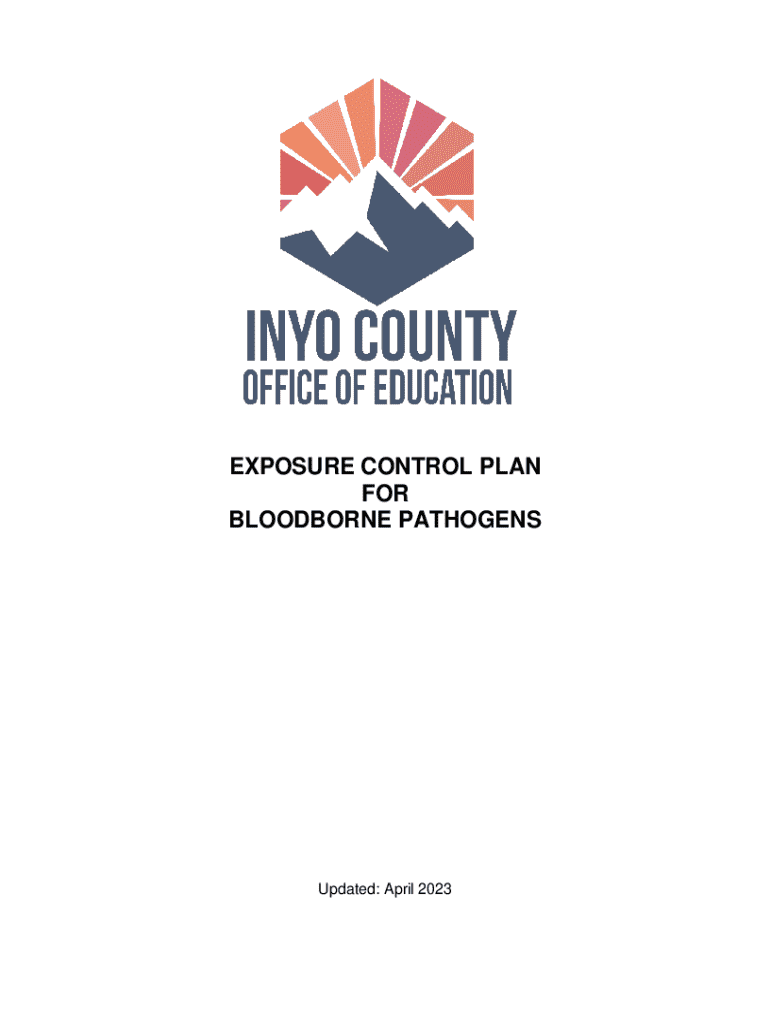 This document serves as the Exposure Control Plan (ECP) for the Inyo County Office of Education, aimed at minimizing occupational exposure to bloodborne pathogens in accordance with OSHA regulations. It details employee exposure determination, vaccination programs, methods of compliance, and procedures for post-exposure evaluation and follow-up, ensuring a safe work environment.