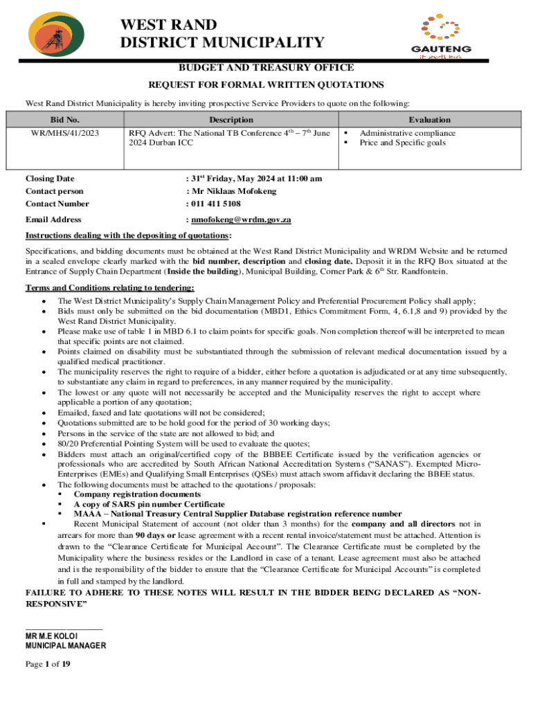 WEST RAND DISTRICT MUNICIPALITY BUDGET AND TREASURY OFFICE REQUEST FOR FORMAL WRITTEN QUOTATIONS West Rand District Municipality is hereby inviting prospective Service Providers to quote on the following: