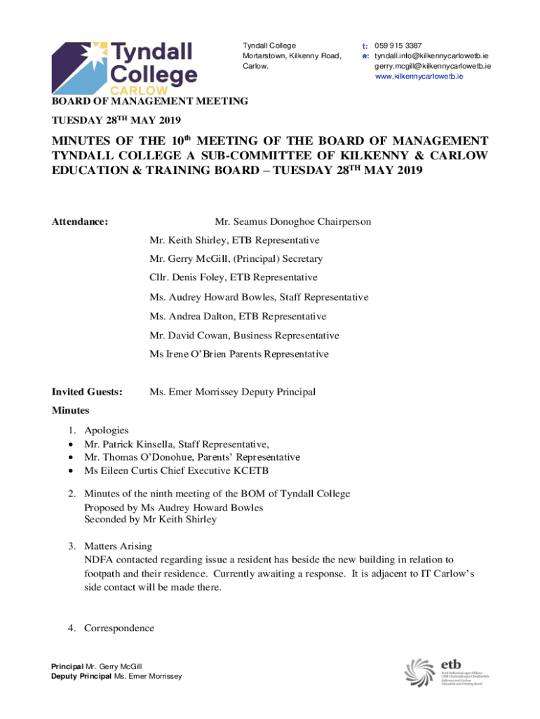 Tyndall College Mortarstown, Kilkenny Road, Carlow.t: 059 915 3387 e: tyndall.info@kilkennycarlowetb.ie gerry.mcgill@kilkennycarlowetb.ie www.kilkennycarlowetb.ieBOARD OF MANAGEMENT MEETING TUESDAY