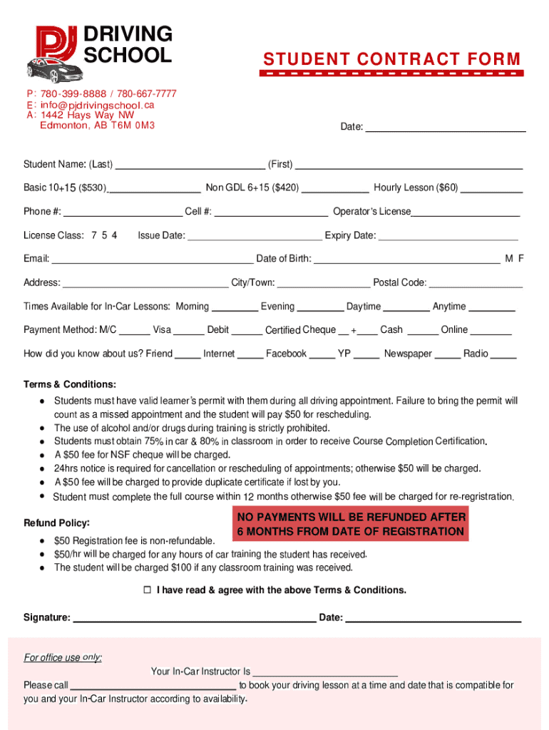 DRIVING SCHOOLSTUDENT CONTRACT FORMP : 780 399 8888 / 7806677777 E : info @ pjdrivingschool . ca A : 1442 Hays Way NW Edmonton , AB T 6 M 0 M 3Date:Student Name: (Last)(First)Basic 10+15 ($530). Phone