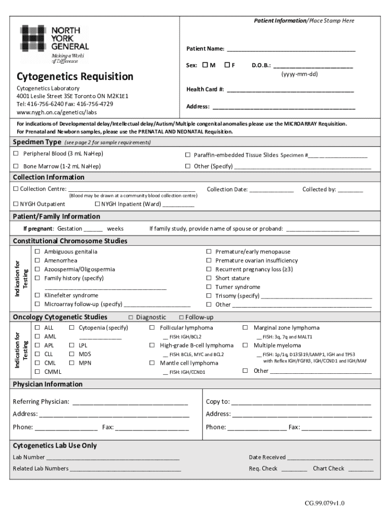 Patient Information/Place Stamp HerePatient Name: ___ Sex: MFCytogenetics Requisition Cytogenetics Laboratory 4001 Leslie Street 3SE Toronto ON M2K1E1 Tel: 4167566240 Fax: 4167564729 www.nygh.on.ca/genetics/labsD.O.B.: