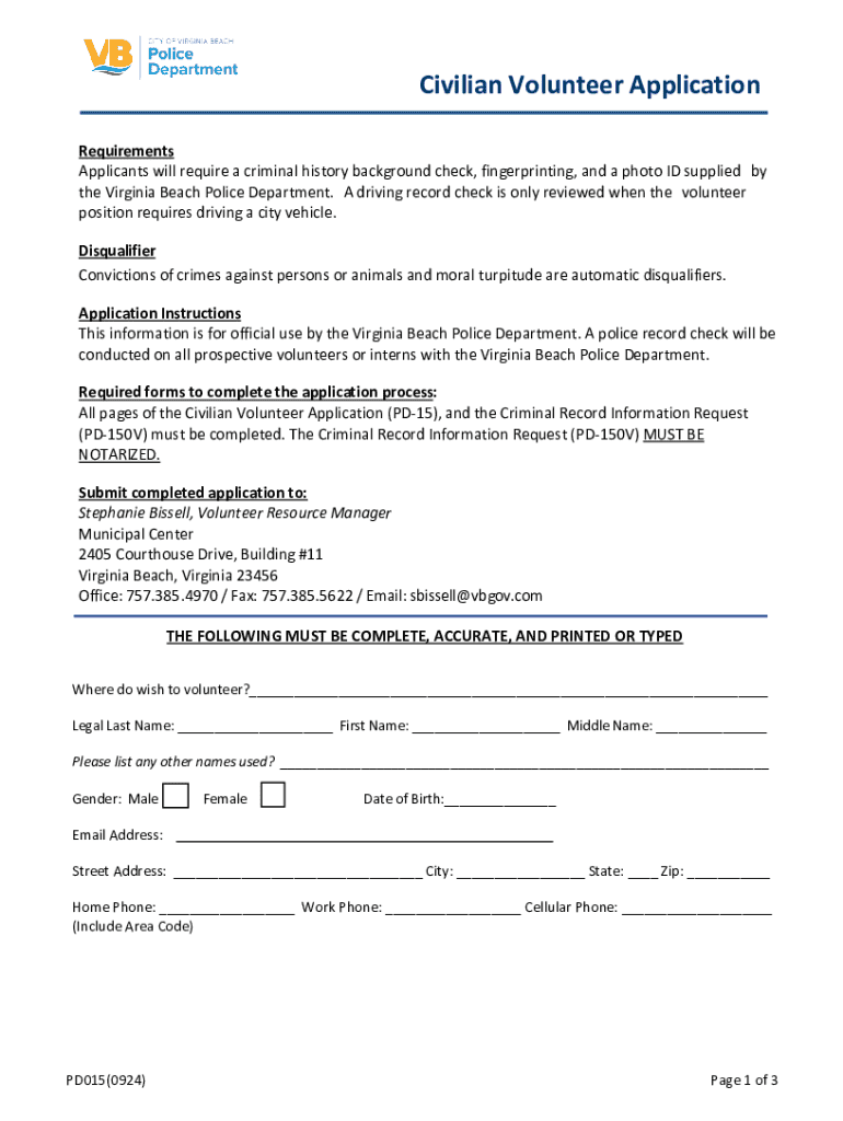 This application form is for individuals interested in volunteering with the Virginia Beach Police Department. It outlines the requirements, application process, necessary forms, and the rules and regulations expected of volunteers. It includes a criminal history background check, the need for notarization, and personal information to be filled out by applicants.
