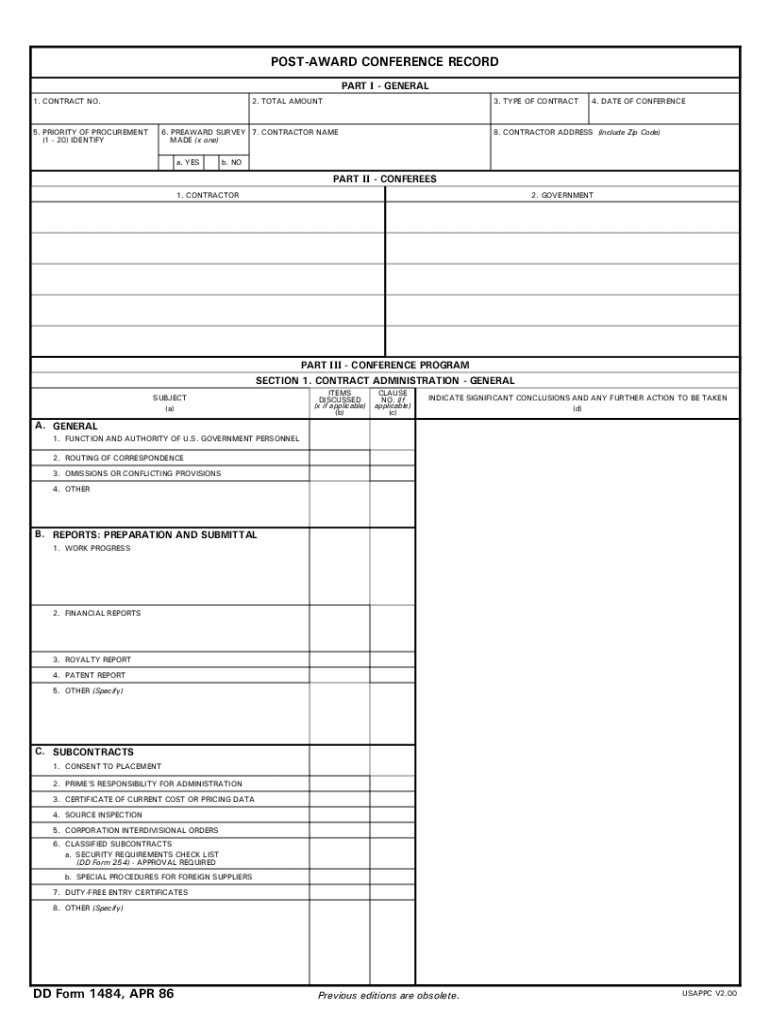 To fill out a post-award conference record, include details such as the date and location of the conference, attendees, topics discussed, decisions made, and any action items assigned. Ensure clarity and accuracy in documenting the proceedings.