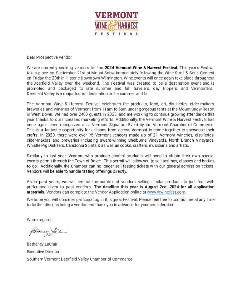 This document serves as the vendor application for the 2024 Vermont Wine & Harvest Festival, outlining event details, vendor requirements, pricing information, and deadlines for participation in the festival celebrating Vermont\'s local food, wine, and artisan products.