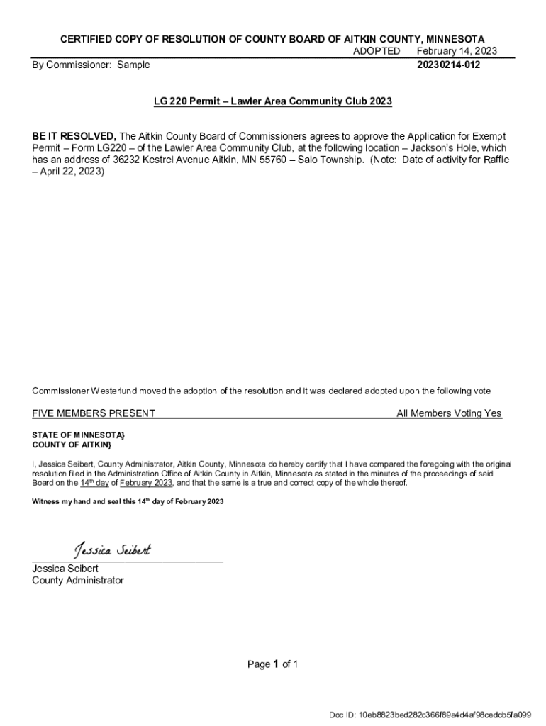 This document contains certified copies of several resolutions adopted by the Aitkin County Board of Commissioners on February 14, 2023. The resolutions include approvals for various permits, a public hearing for tax-forfeited land classification, a fund transfer for the Long Lake Conservation Center, a grant application for the Federal Recreational Trail Program, and the identification of high-priority bridges for replacement and rehabilitation.