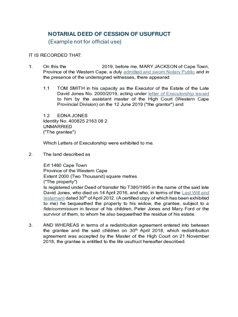 This document records the cession of a life usufruct over a property from the Executor of the Estate of the Late David Jones to Edna Jones, pursuant to a redistribution agreement and the deceased\'s Last Will and Testament.