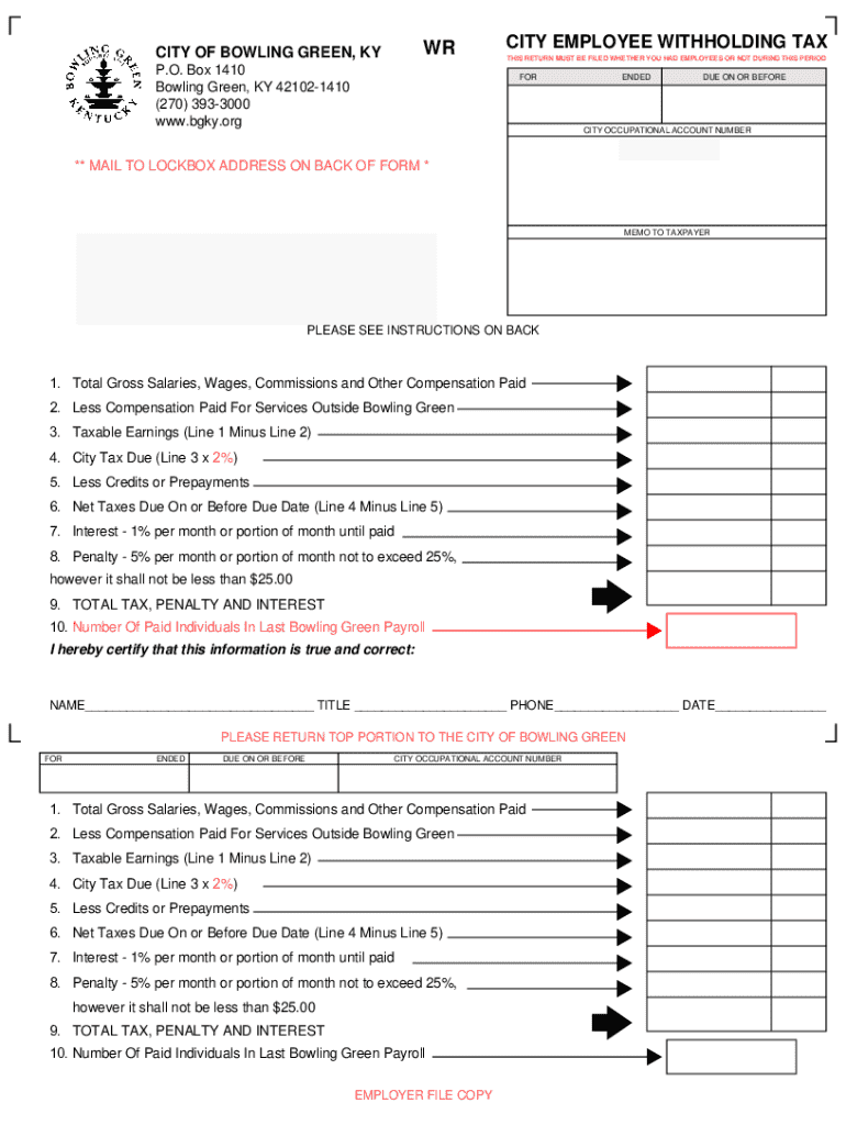 This document serves as the official return for city employee withholding taxes for businesses operating in Bowling Green, KY. It is mandatory to file this return regardless of whether the business had employees during the tax period. The form includes calculations for gross salaries, taxable earnings, city tax due, and penalties for late payment.