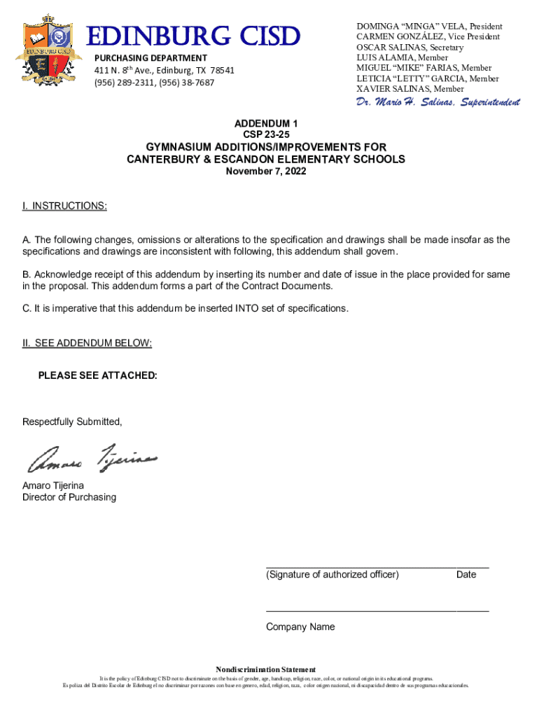 EDINBURG CISD PURCHASING DEPARTMENT 411 N. 8th Ave., Edinburg, TX 78541 (956) 2892311, (956) 387687DOMINGA MINGA VELA, President CARMEN GONZLEZ, Vice President OSCAR SALINAS, Secretary LUIS ALAMIA,