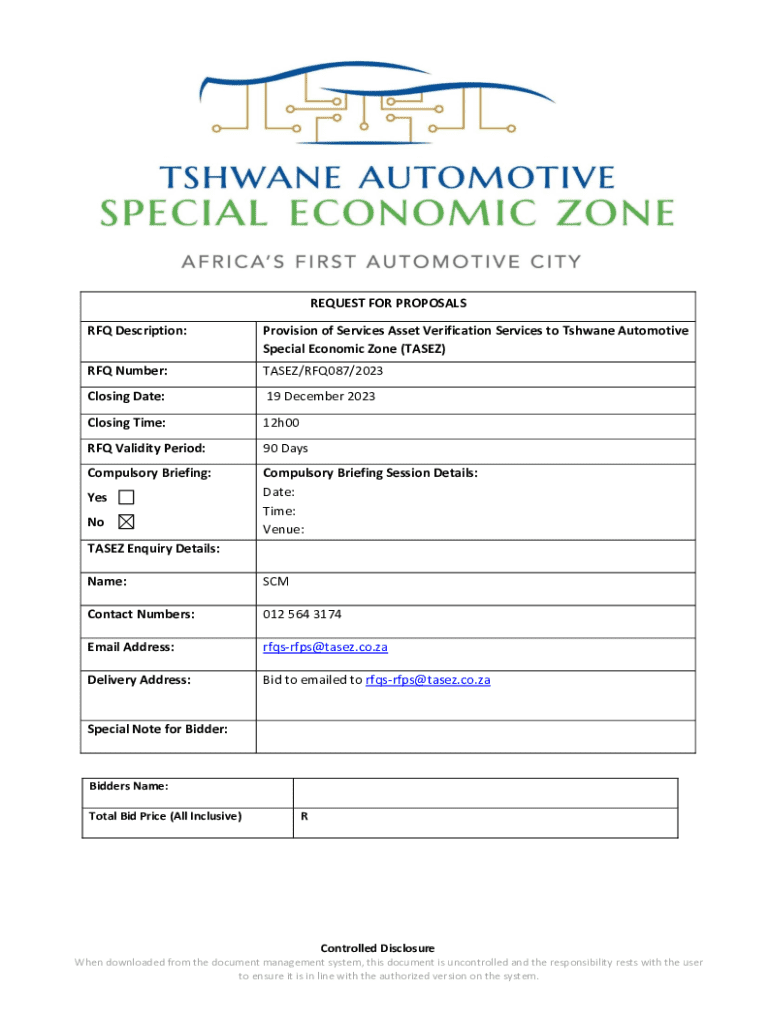 This document outlines the specifications and requirements for the provision of Asset Verification Services to the Tshwane Automotive Special Economic Zone (TASEZ). Bidders are invited to submit proposals detailing their pricing, methodology, and compliance with procurement regulations. The RFQ includes conditions for bidding, compulsory briefing sessions, evaluation criteria, and the returnable documents needed for submission.