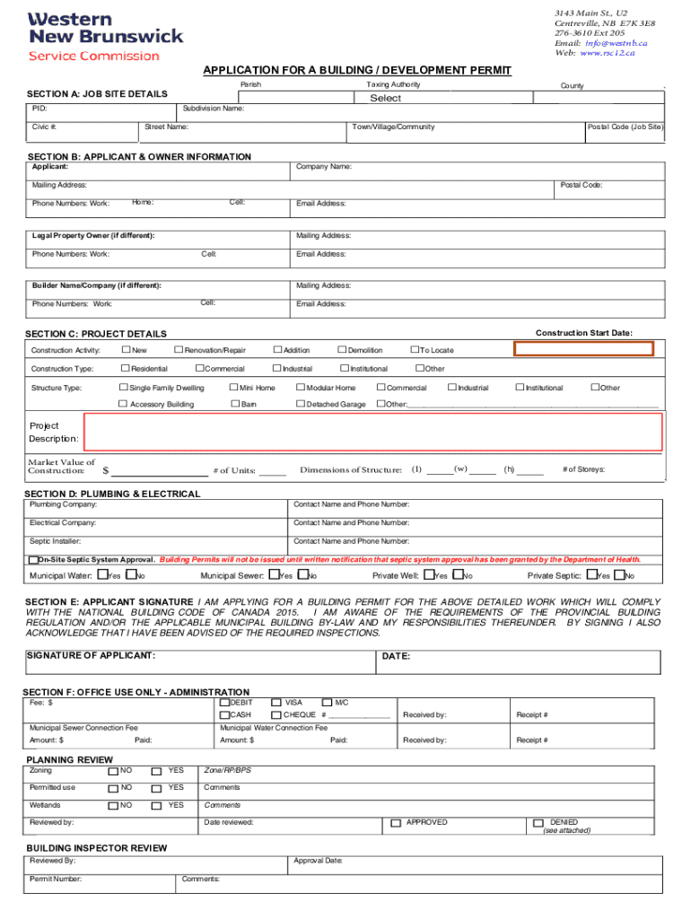 This document serves as an application form for obtaining a building or development permit. It includes sections for job site details, applicant and owner information, project details, plumbing and electrical specifications, and office administration notes.