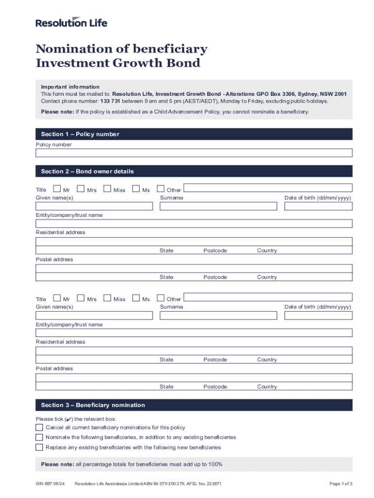 Nomination of beneficiary Investment Growth Bond Important information This form must be mailed to: Resolution Life, Investment Growth Bond Alterations GPO Box 3306, Sydney, NSW 2001 Contact phone