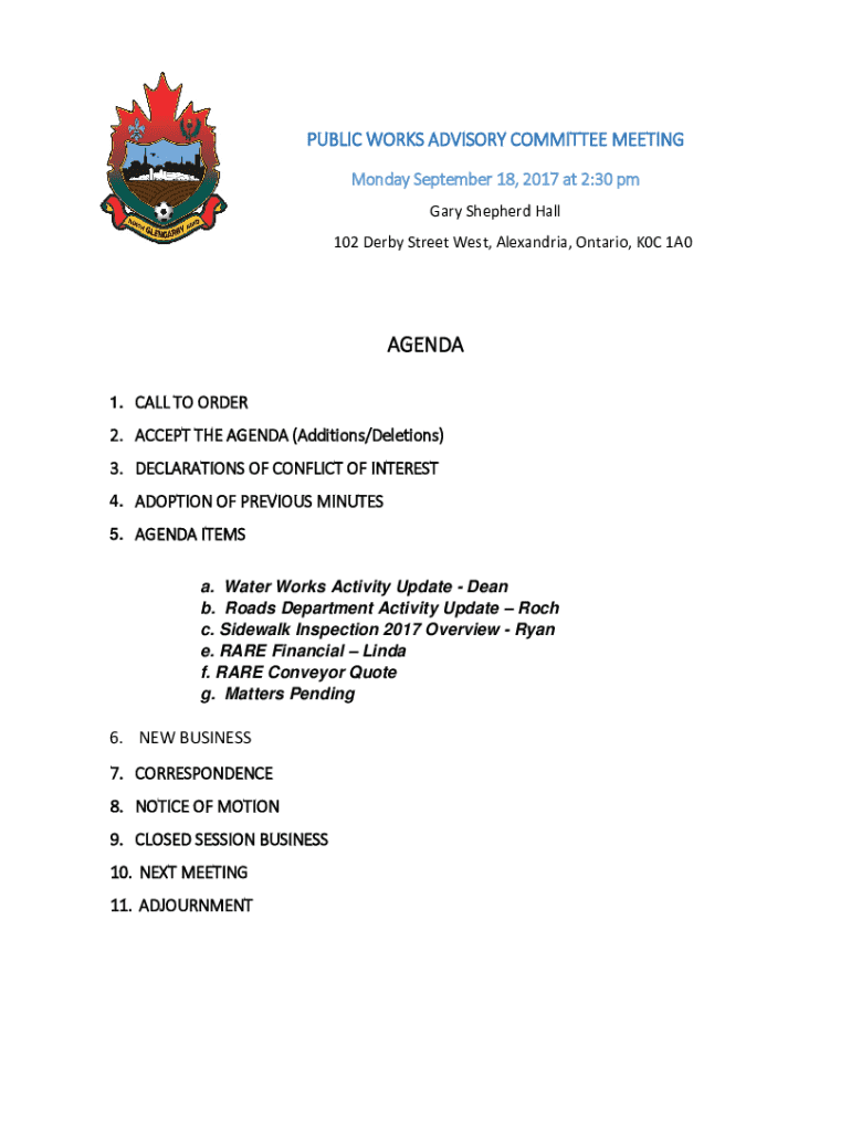 This document outlines the agenda and minutes of the Public Works Advisory Committee meetings held on August 21, 2017, and September 18, 2017. It includes updates on various departmental activities, conflict of interest declarations, and financial reports related to public works activities in the Township of North Glengarry.