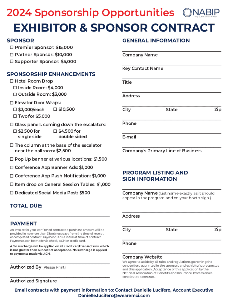 This document outlines the sponsorship opportunities available at the NABIP Capitol Conference 2024, detailing various sponsorship levels, benefits, costs, and rules for exhibitors. It provides information on speaking opportunities, mobile app benefits, promotional strategies, and guidelines for participants. The goal is to enhance visibility for sponsors while ensuring a successful conference experience.