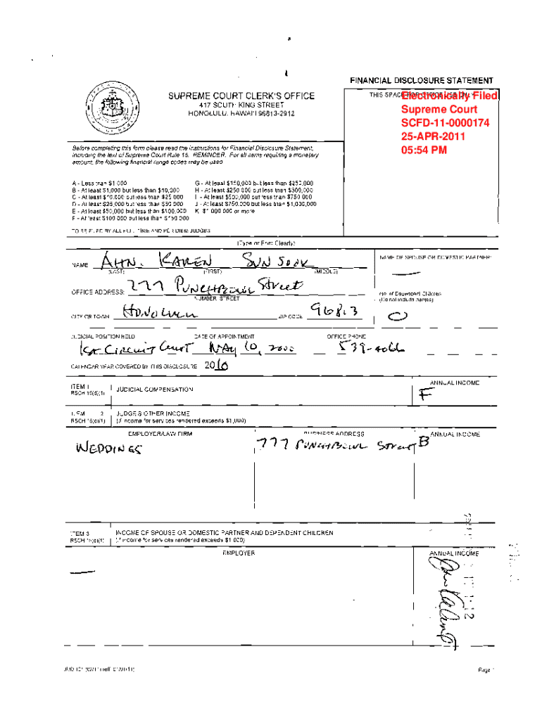 This document is a Financial Disclosure Statement that must be electronically filed by all full-time and per diem judges in accordance with Supreme Court Rule 15. It includes various fields for judges to disclose their financial interests, annual income, and any gifts received, within specified monetary ranges. The form aims to promote transparency and prevent conflicts of interest among judges.