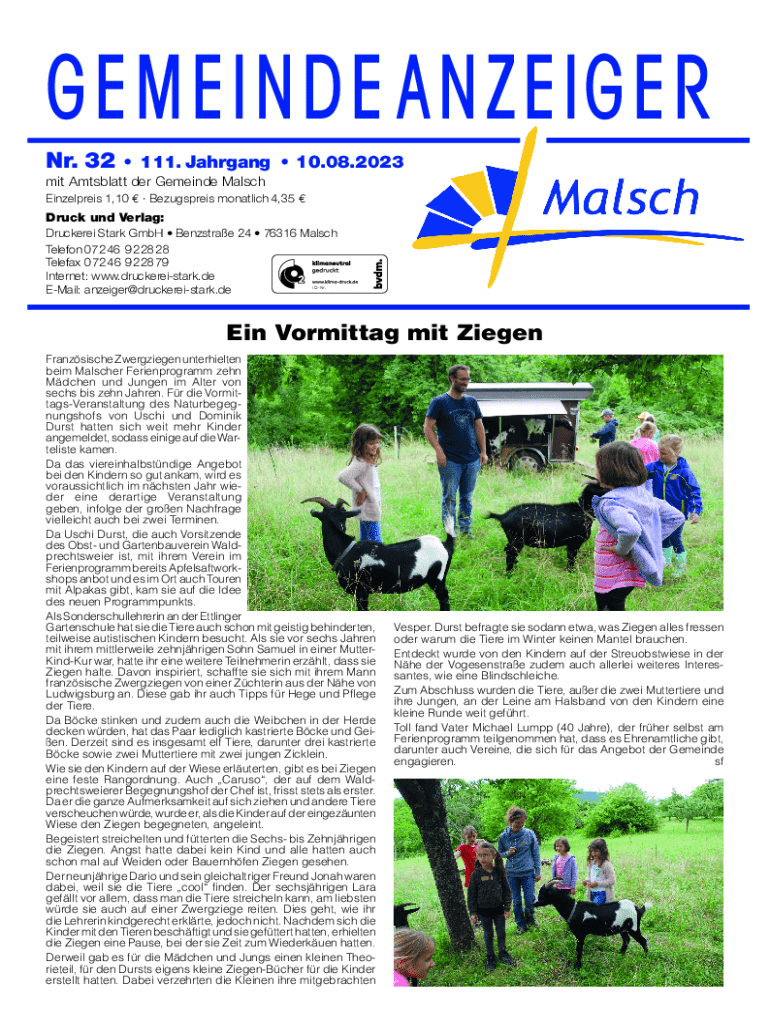 GEMEINDE ANZEIGER Nr. 32 111. Jahrgang 10.08.2023mit Amtsblatt der Gemeinde Malsch Einzelpreis 1,10 Bezugspreis monatlich 4,35 Druck und Verlag: Druckerei Stark GmbH Benzstrae 24 76316 Malsch Telefon