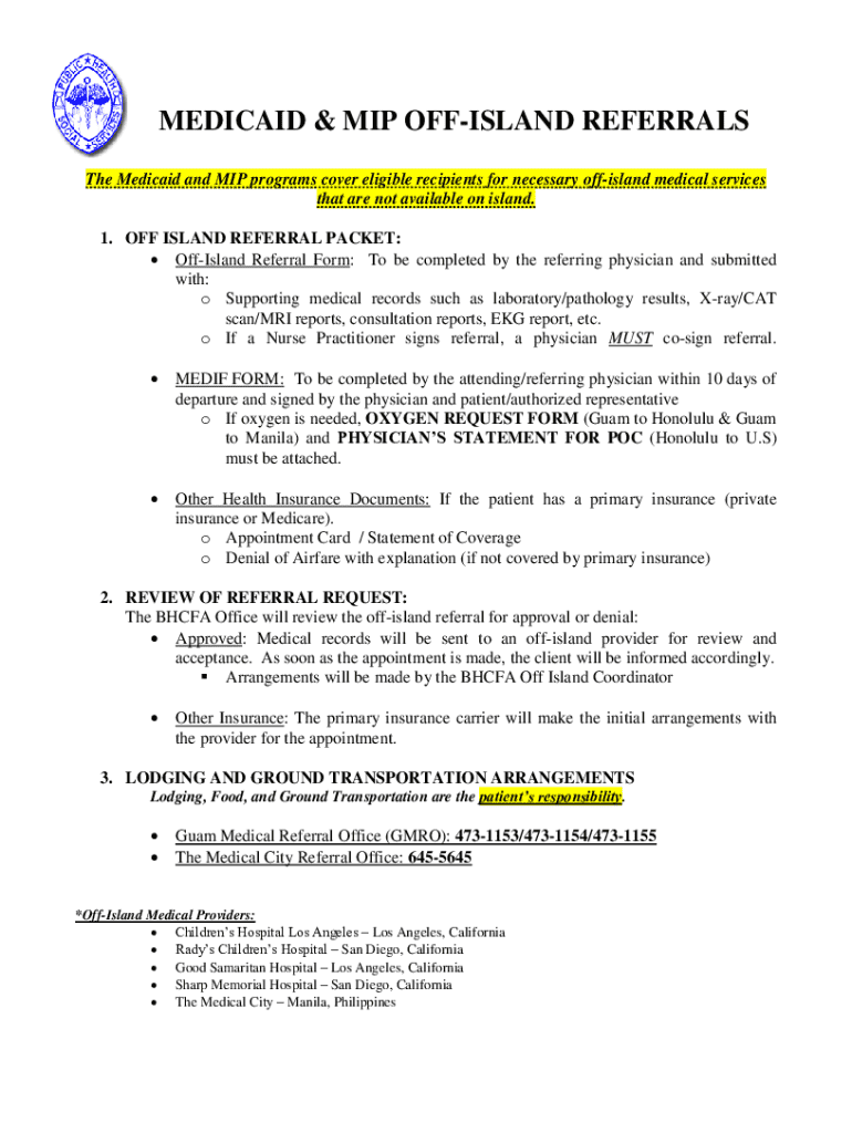MEDICAID & MIP OFFISLAND REFERRALS The Medicaid and MIP programs cover eligible recipients for necessary offisland medical services that are not available on island. 1. OFF ISLAND REFERRAL PACKET: