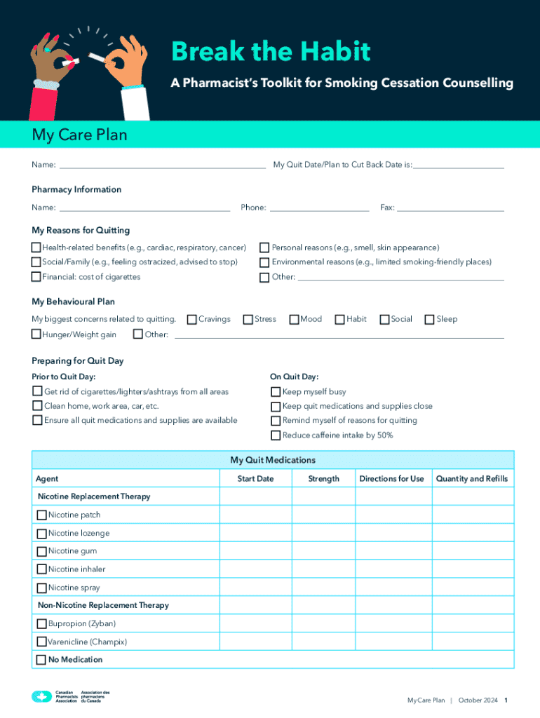 This document is a comprehensive toolkit designed for pharmacists to assist individuals in quitting smoking. It provides a structured care plan including reasons for quitting, behavioral strategies, monitoring plans, managing withdrawal symptoms, and reminders for maintaining a smoke-free lifestyle. The document emphasizes the importance of using quit medications and offers practical tips for success.