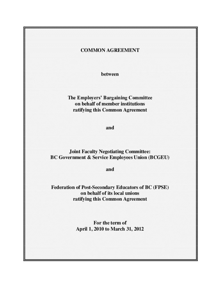 This Common Agreement establishes collective bargaining procedures and outlines the responsibilities and rights of both the Employers’ Bargaining Committee and the Joint Faculty Negotiating Committee. It covers terms including harassment, employer/union relations, job security, leaves, health benefits, and more, applicable for the term April 1, 2010 to March 31, 2012.