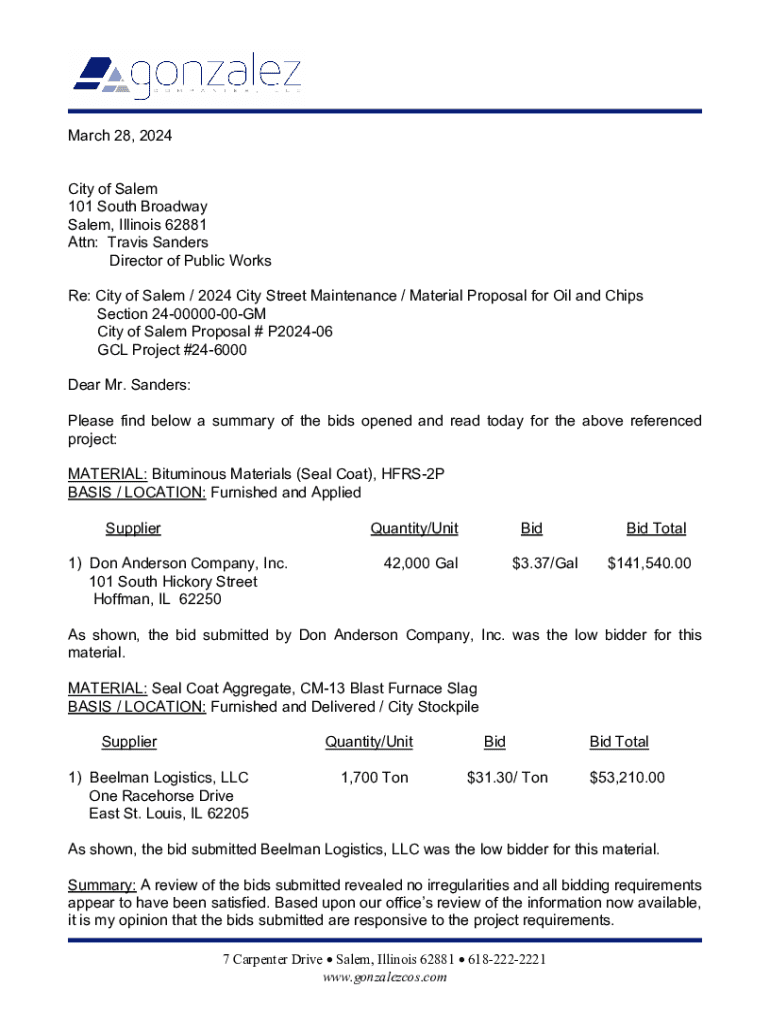 This document summarizes the bids for the City of Salem\'s 2024 street maintenance project, specifically for the Bituminous Materials (Seal Coat) HFRS-2P and Seal Coat Aggregate CM-13 Blast Furnace Slag. It includes bid amounts, detailed information about the suppliers, and a recommendation for the acceptance of the low bids.