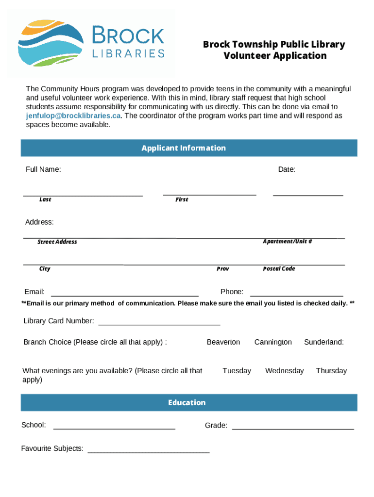 Brock Township Public Library Volunteer Application The Community Hours program was developed to provide teens in the community with a meaningful and useful volunteer work experience. With this in