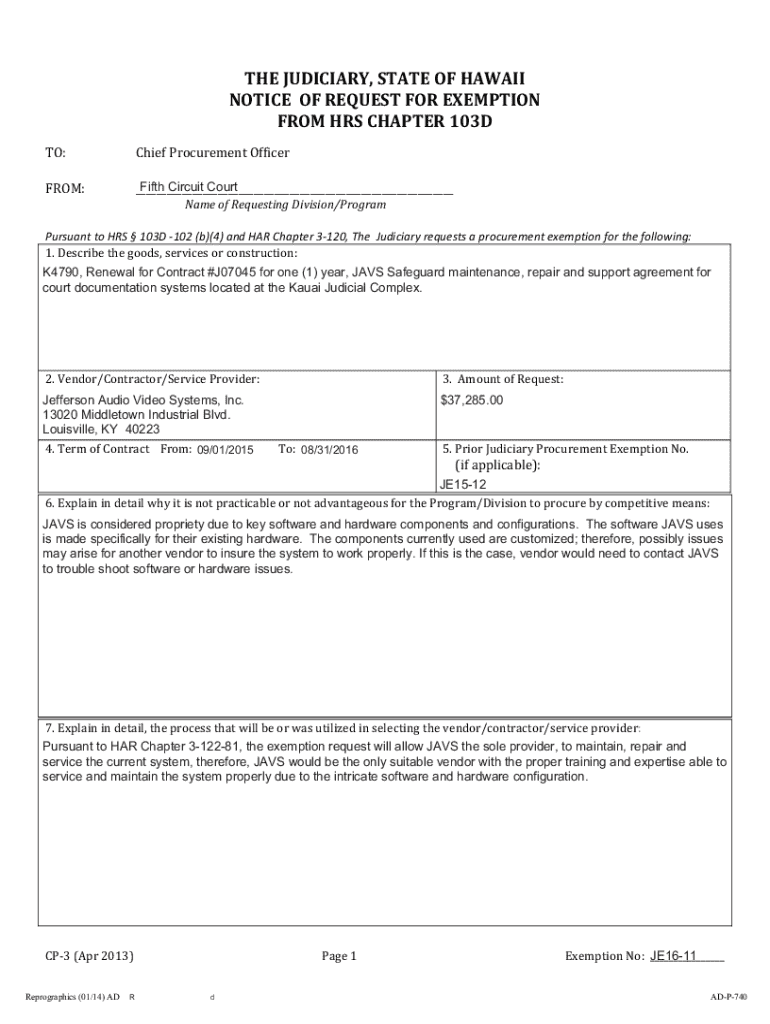 THE JUDICIARY, STATE OF HAWAII NOTICE OF REQUEST FOR EXEMPTION FROM HRS CHAPTER 103D TO:Chief Procurement OfficerJFROM: JFifth Circuit Court ___ Name of Requesting Division/ProgramPursuantftofHRSff1030f102f(b)(4)fandfHARfChapterf3120,fTheffJudiciaryfrequestsfafprocurementfexemptionf