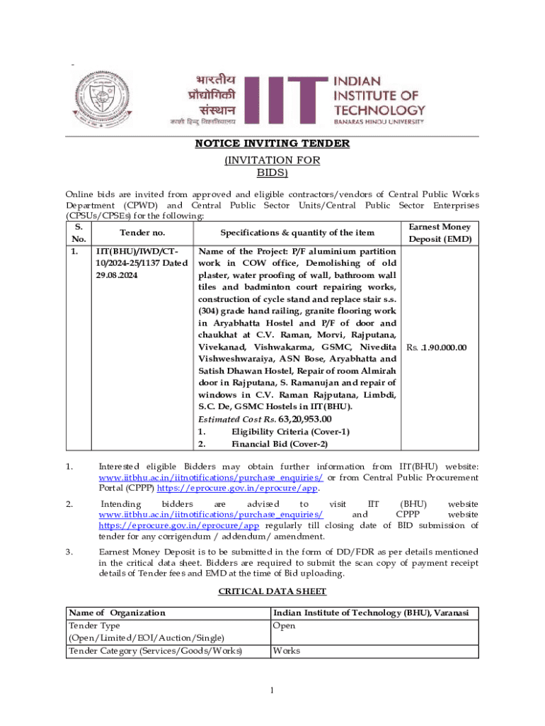 2NOTICE INVITING TENDER (INVITATION FOR BIDS) Online bids are invited from approved and eligible contractors/vendors of Central Public Works Department (CPWD) and Central Public Sector Units/Central