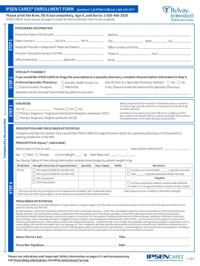 The IPSEN CARES Enrollment Form is designed for prescribers to enroll patients in the IPSEN CARES program, related to the medication Bylvay, used for treating cholestatic pruritus in specific patient groups. It requires comprehensive patient and prescriber information, including diagnosis, prescription details, and insurance information, to facilitate enrollment and access to support services.