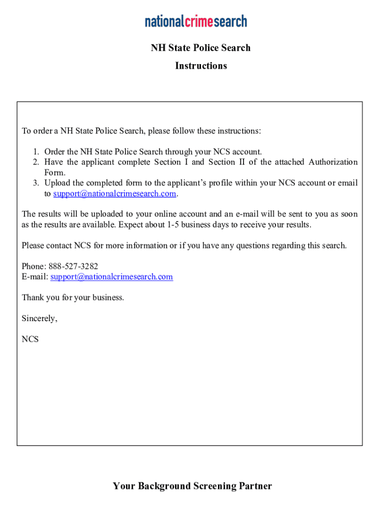 This document provides detailed instructions on how to order a NH State Police Search through the NCS account, including the necessary steps and the authorization procedure for accessing criminal history record information in New Hampshire.