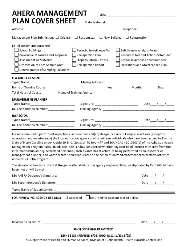Requirements for Asbestos Reinspection Reports at Schools For schools, all asbestos reinspection reports must have the following layout:1. NC AHERA Management Plan Cover Sheet: DHHS 3531 2. NC AHERA