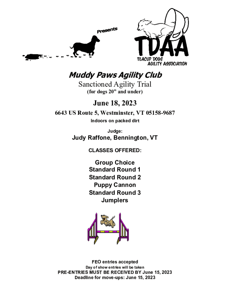 This document outlines the details of the Muddy Paws Agility Club Sanctioned Agility Trial for dogs 20 inches and under, including classes offered, entry requirements, and event information for participants. The trial is scheduled for June 18, 2023, in Westminster, VT, and includes various agility classes and rules established by the Teacup Dogs Agility Association.