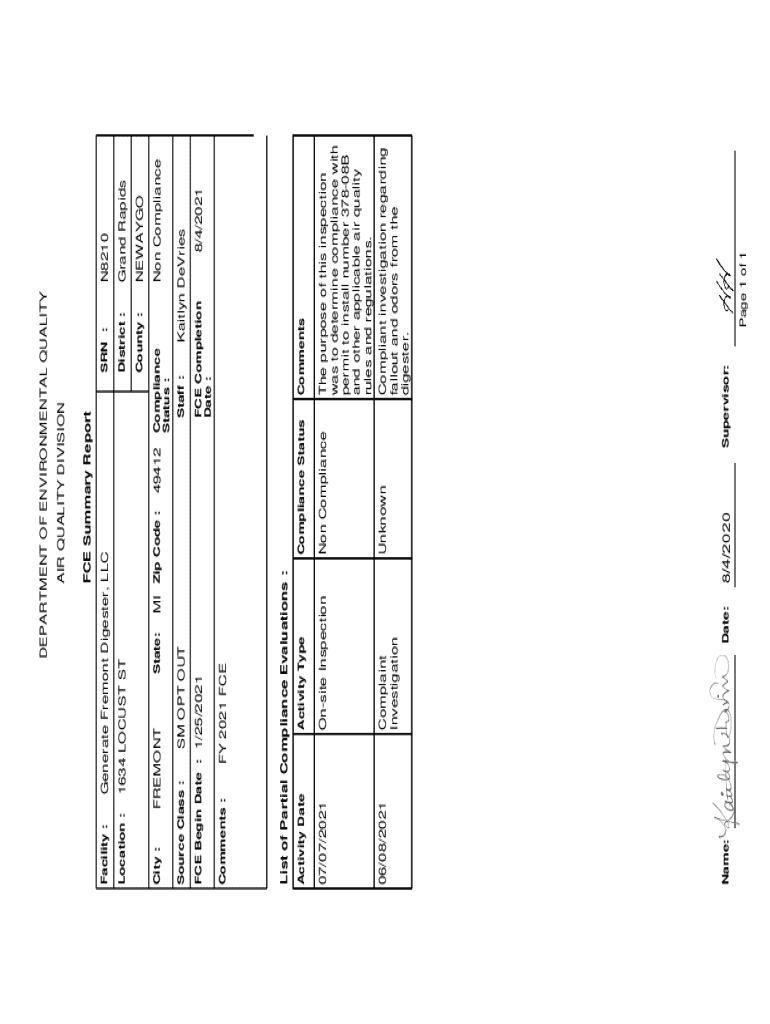 FY 2021 FCEOnsite InspectionComplaint Investigation07/07/202106/08/2021Date:Activity TypeActivity DateName:NEWAYGOCounty :8/4/2020UnknownCompliant investigation regarding fallout and odors from the