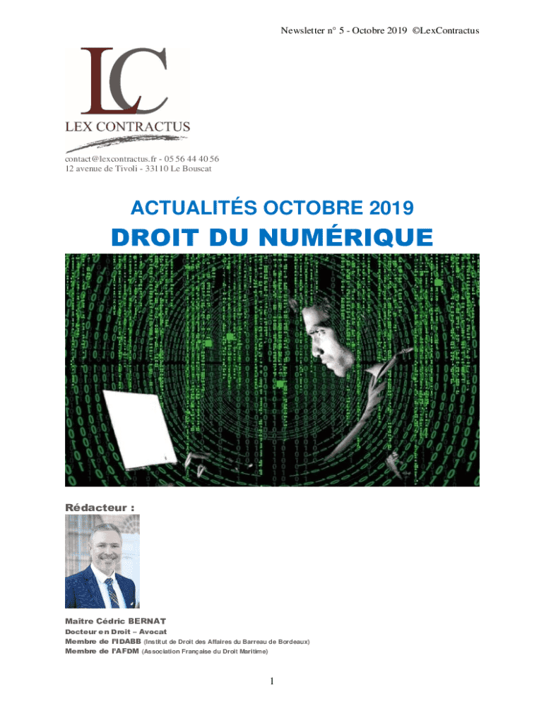 Newsletter n 5 Octobre 2019 LexContractuscontact@lexcontractus.fr 05 56 44 40 56 12 avenue de Tivoli 33110 Le BouscatACTUALITS OCTOBRE 2019DROIT DU NUMRIQUERdacteur :Matre Cdric BERNAT Docteur en